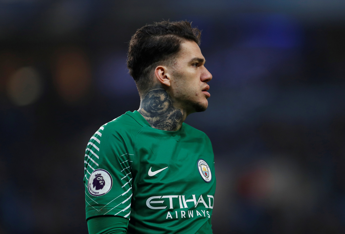 Soccer Football - Premier League - Manchester City vs AFC Bournemouth - Etihad Stadium, Manchester, Britain - December 23, 2017 Manchester City's Ederson and Nicolas Otamendi in action with Bournemouth's Steve Cook Action Images via Reuters/Lee Smith