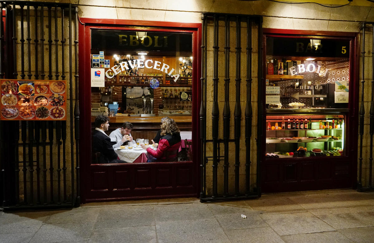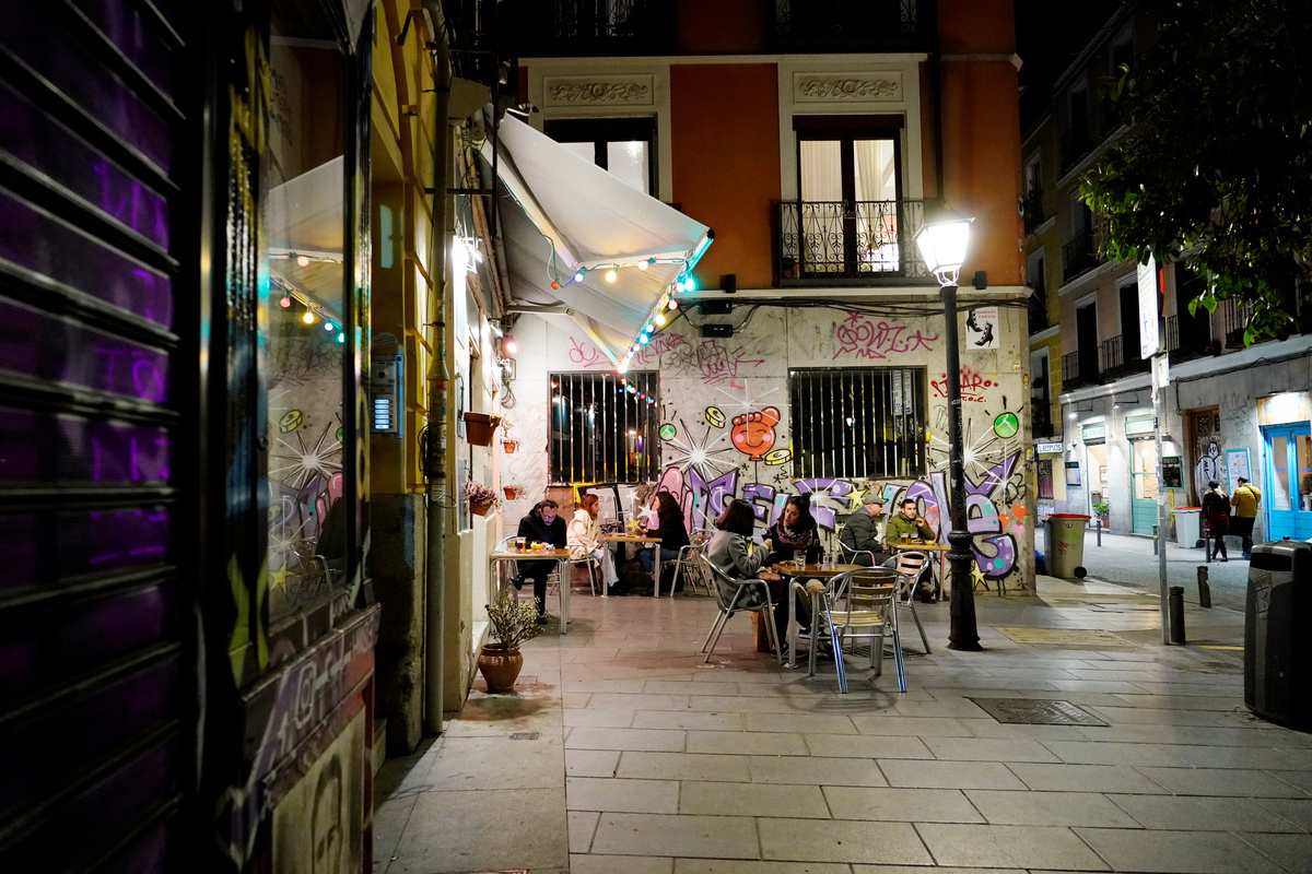 A long line of young people, many maskless and smoking, queue to enter a trendy Madrid bar in an evening scene common across the Spanish capital's bustling centre.