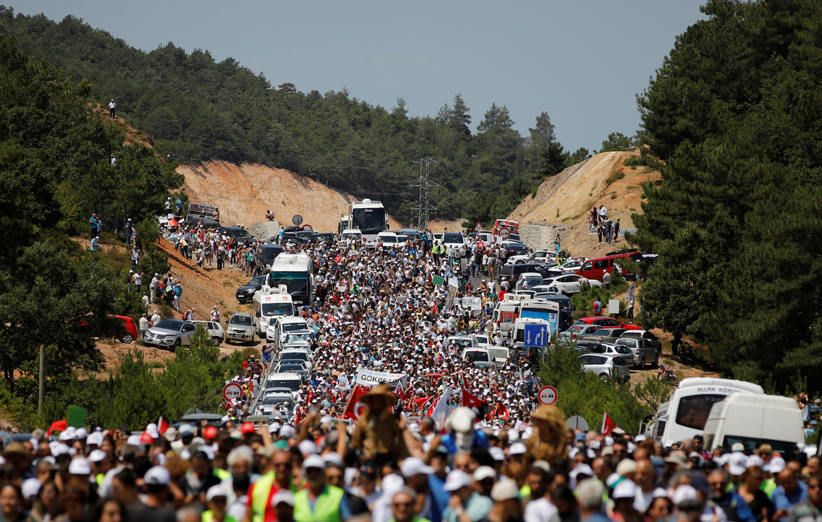 KIRAZLI, Turkey (Reuters) - Thousands of Turks including opposition lawmakers staged a peaceful and unusually large protest on the outskirts of a small western town on Monday against what they say will be pollution from a foreign-owned gold mine project.