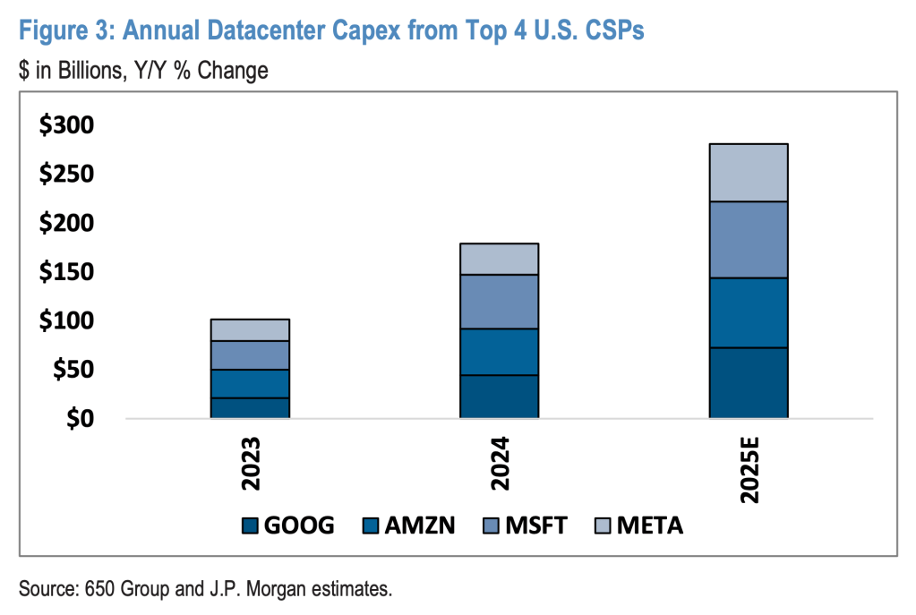 “On a dollar basis, the growth implies a significant increase of more than +$100 billion of additional data center capex in 2025, the largest annual step-up to date, surpassing the record set in 2024. Importantly, the stronger trajectory is also anticipated to carry into 2026, where growth is now tracking at … more than +$80 billion for next year.” Capex will be in the region of $300 billion this year from Google, Amazon, Microsoft, and Meta alone, Goldman estimates.