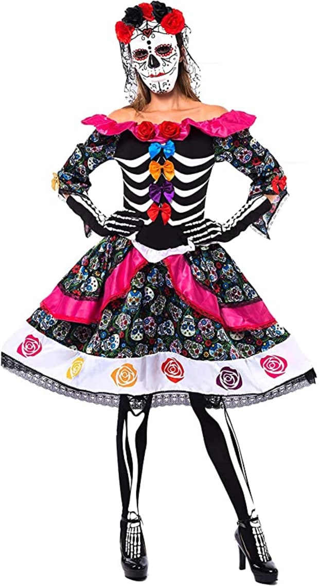 With a 4.5-star Amazon rating, this Day of the Dead costume has everything you need for a colorful and creative costume. In Mexico, people celebrate the Day of the Dead, or Dia de los Meurtos, on Nov. 2 with food, drinks, and dancing, as they wait for souls to rejoin their families for the day.