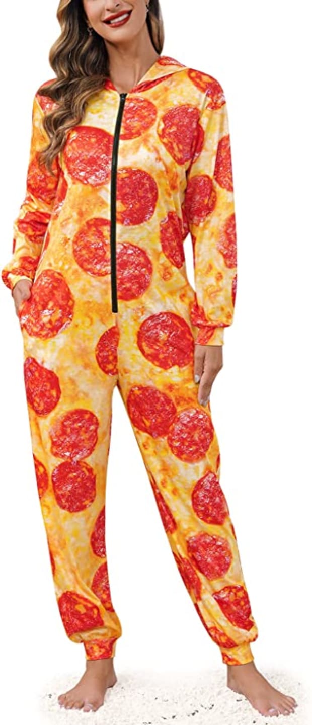 If you want to be the most controversial couple at the Halloween gathering, grab this pizza onesie costume and walk around with your partner, who is dressed up as a pineapple! Just like the avocado and pineapple onesies, these pajamas feature side pockets, a zip-up front closure, and a hood for chilly fall nights.