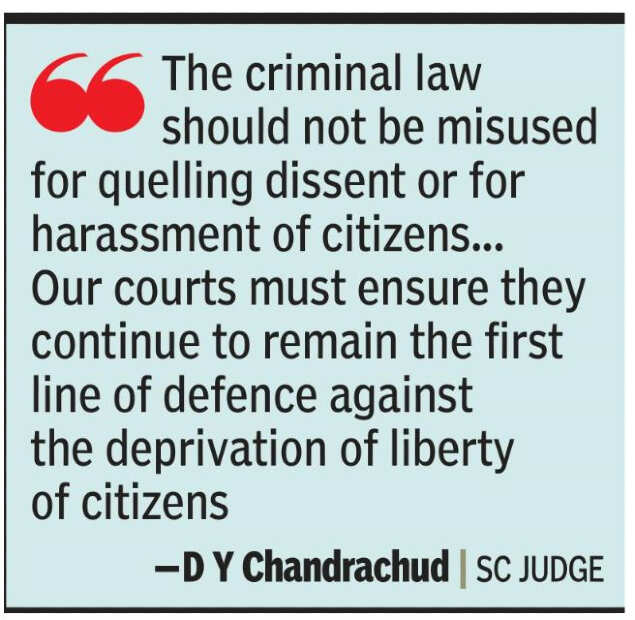 NEW DELHI: Underlining the role of the Supreme Court as a “counter-majoritarian institution” to protect the socio-economic rights of people, particularly minorities, Justice D Y Chandrachud has said that criminal laws should not be misused to silence dissent and harass citizens.