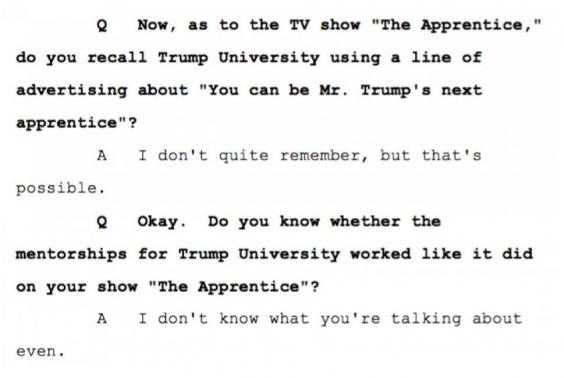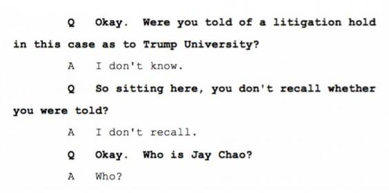 At one point, Trump was asked if he remembered the names of any of the instructors who provided instruction at Trump University -- a group that the organization had touted as being hand-picked by Trump. "Can you identify a single person who was a live events instructor for Trump University?" the attorneys for the plaintiff asked Trump. "You'd have to give me a list," Trump replied.