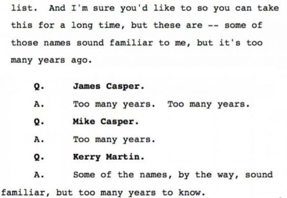 This is one deposition. Similar responses are littered through the other Trump documents: Failures to remember meetings, business deals, individuals, if he signed documents. When asked how many times he'd given testimony, Trump figured it was in the hundreds; in each of those hundreds of depositions and interviews, it's almost certainly the case that Trump was stymied on obscure details any number of times.