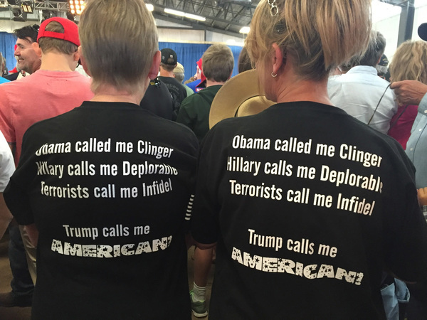 Kathy Smith and her neighbor were waiting eagerly last month for Trump to speak at a rally in Golden, Colo., wearing matching "Deplorable American" T-shirts.