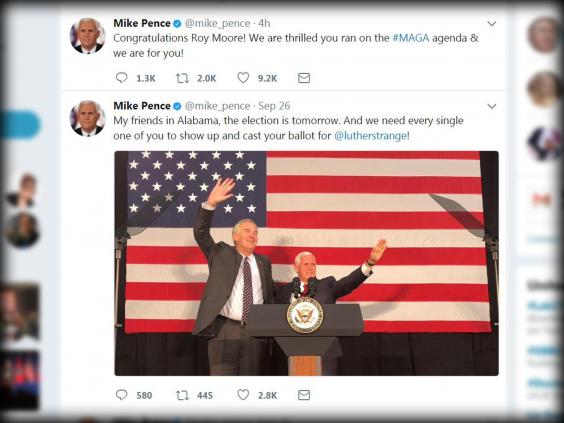 Mr Pence chose not to delete his most recent pro-Strange tweet, which sits directly below the message of congratulations in his feed. He wrote: “Congratulations Roy Moore! We are thrilled you ran on the #MAGA agenda & we are for you!”