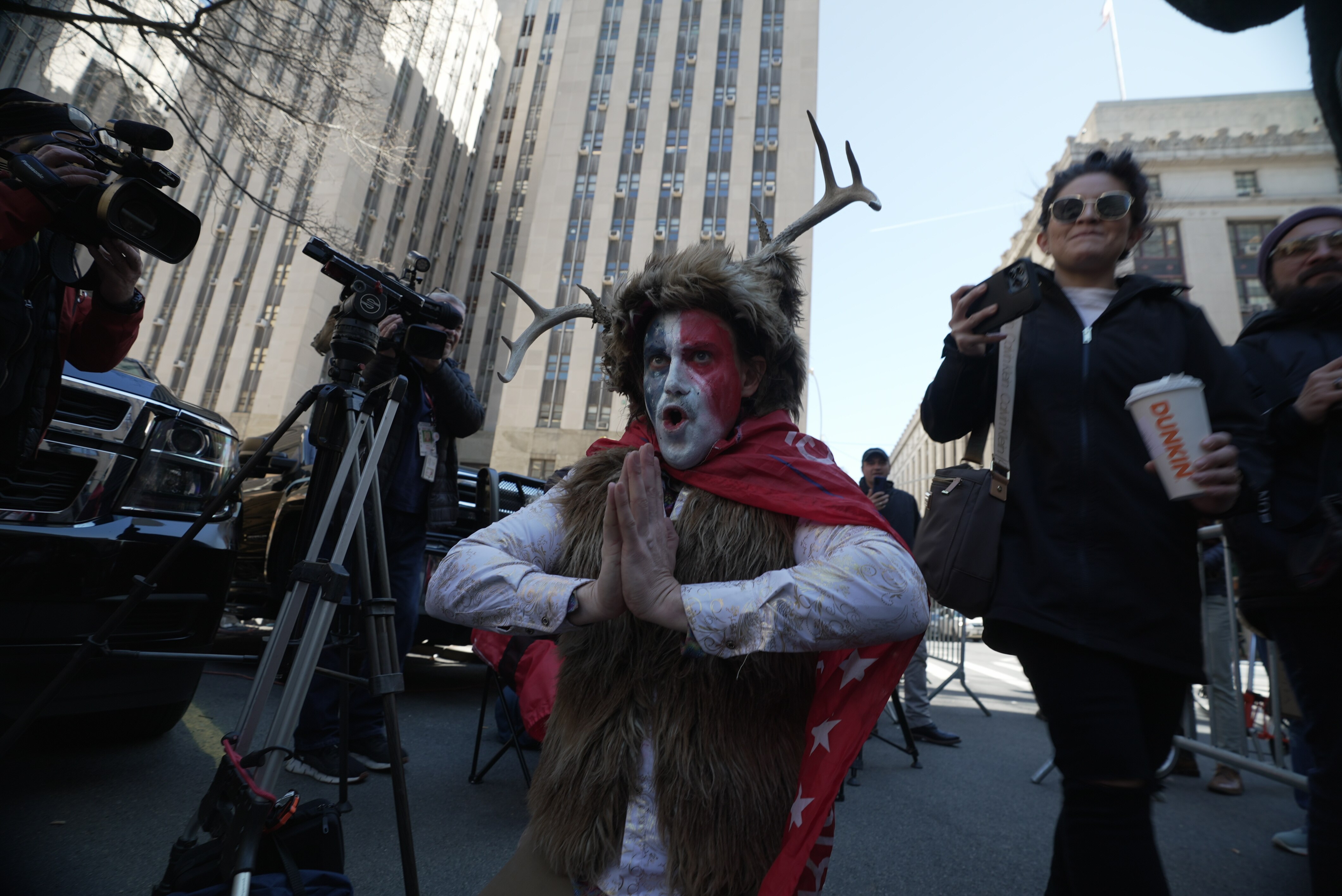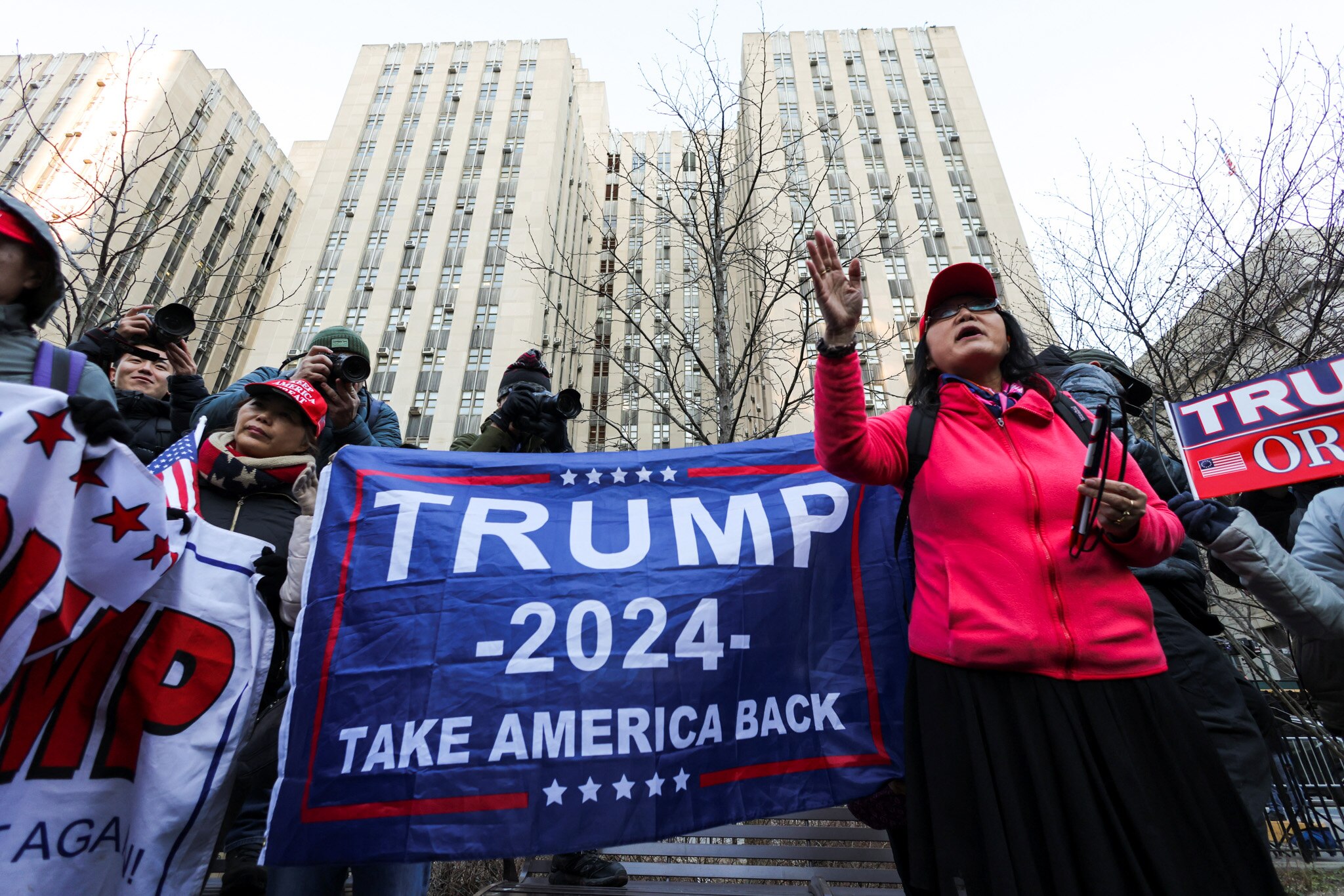 And while a handful of pro- and anti-Trump demonstrators have gathered outside, they are far outnumbered by members of the media.