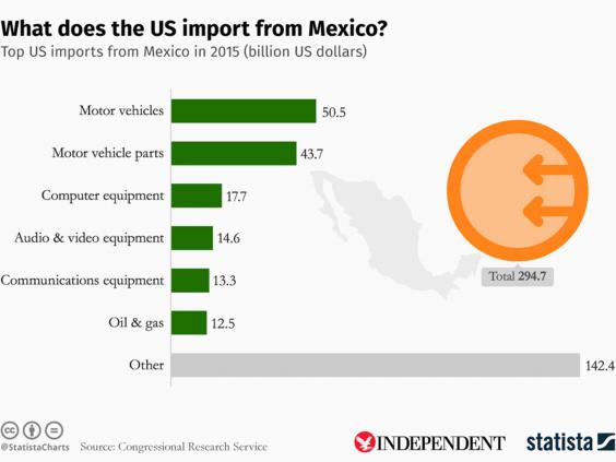 As the Statista chart shows, the US imports over $50bn worth of motor vehicles and nearly $44bn worth of vehicle parts from Mexico.