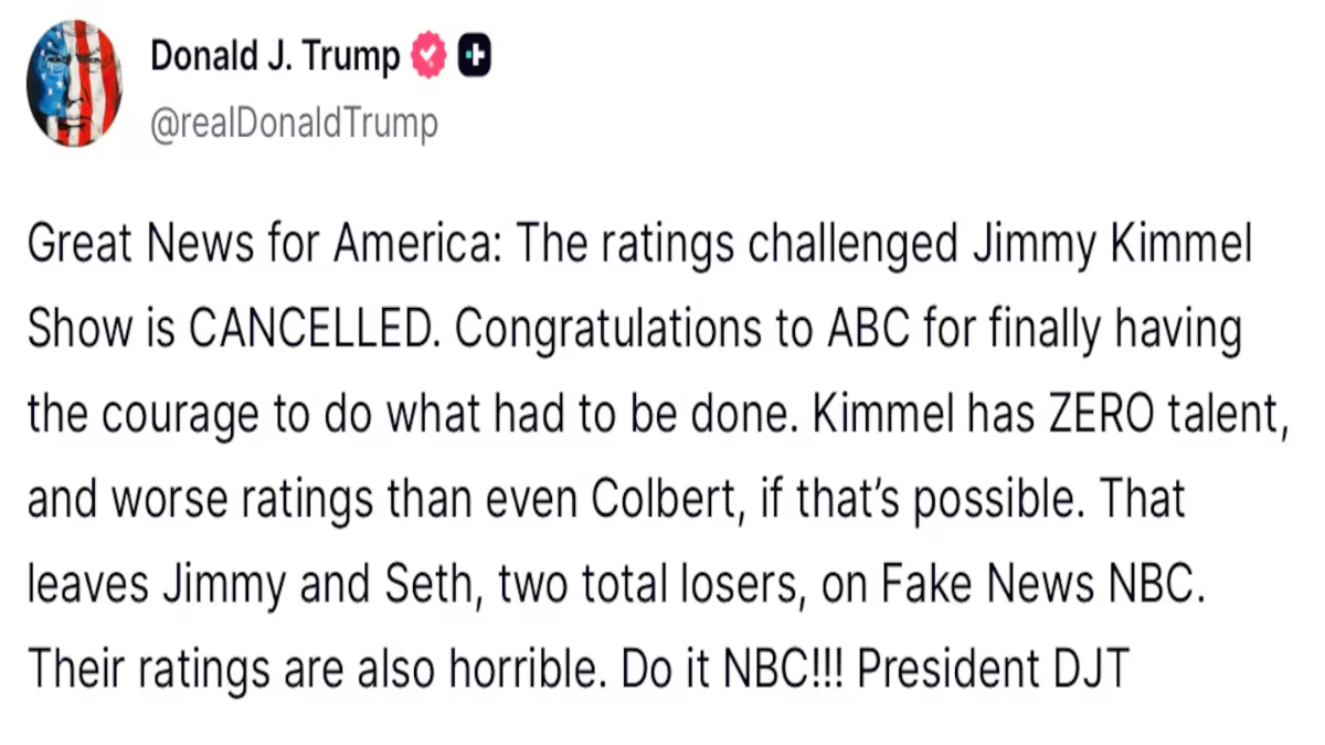 In his earlier post celebrating his unconstitutional display of power over Kimmel, Trump also subtly warned NBC News to part ways with their late-night hosts, Seth Meyers and Jimmy Fallon, calling them “two total losers.” These open threats by the man holding the highest federal office are a direct war on the future of the free press in the country.