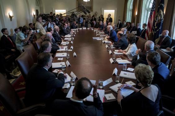 Despite that, his cabinet members took the opportunity to suggest he and they had preformed wonders. A pool report of the meeting noted that after Mr Trump spoke, “cabinet members each introduced themselves and said a few words about how happy they were to be there”.