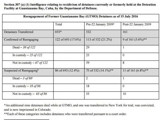 It found that 122 out of 693 former detainees surveyed – 18 per cent - had been “confirmed” as having reengaged in terrorist or insurgent activities.