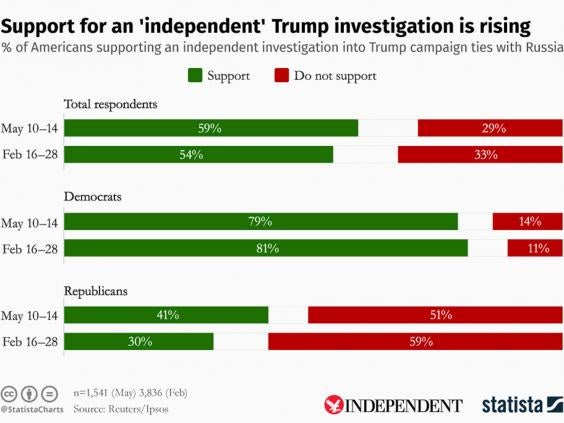 Support for an independent investigation into ties between Mr Trump's campaign team and the Kremlin has been rising to stand at around 60 per cent, according to a chart for The Independent by Statista.