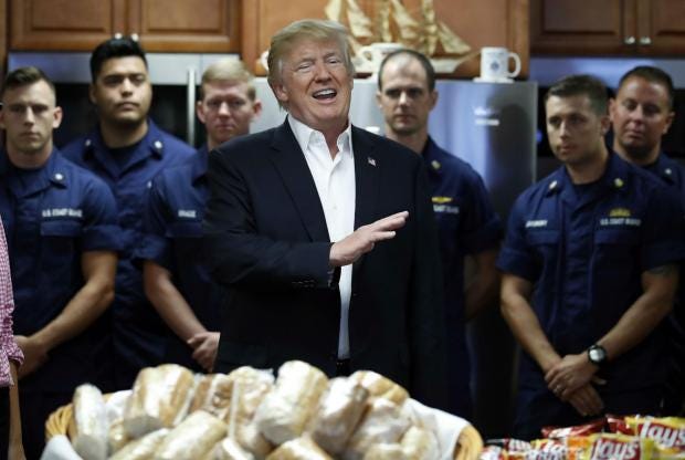 [inaudible, Trump turns back around] but when you've got 16,000, that's really something. And then Florida hit. And you know that went very well, you know that went pretty well, right? The job you did in Florida. And then Puerto Rico. I really mean that, I think that there's no brand of any kind, I don't just mean a military brand, that's gone up more than the Coast Guard. Incredible people. You've done an incredible job. I love coming in here and doing this with you today. I think it's — we have to keep you very well fed. This is good stuff. It's an honour. This is the first lady, you know.