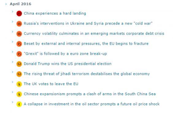It ranked sixth in the top 10, which was topped by a “hard landing” for China's economy. Russia's interventions in Ukraine and Syria precede a new “cold war” was second, with an emerging markets corporate debt crisis in third.