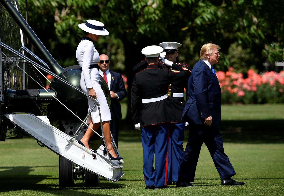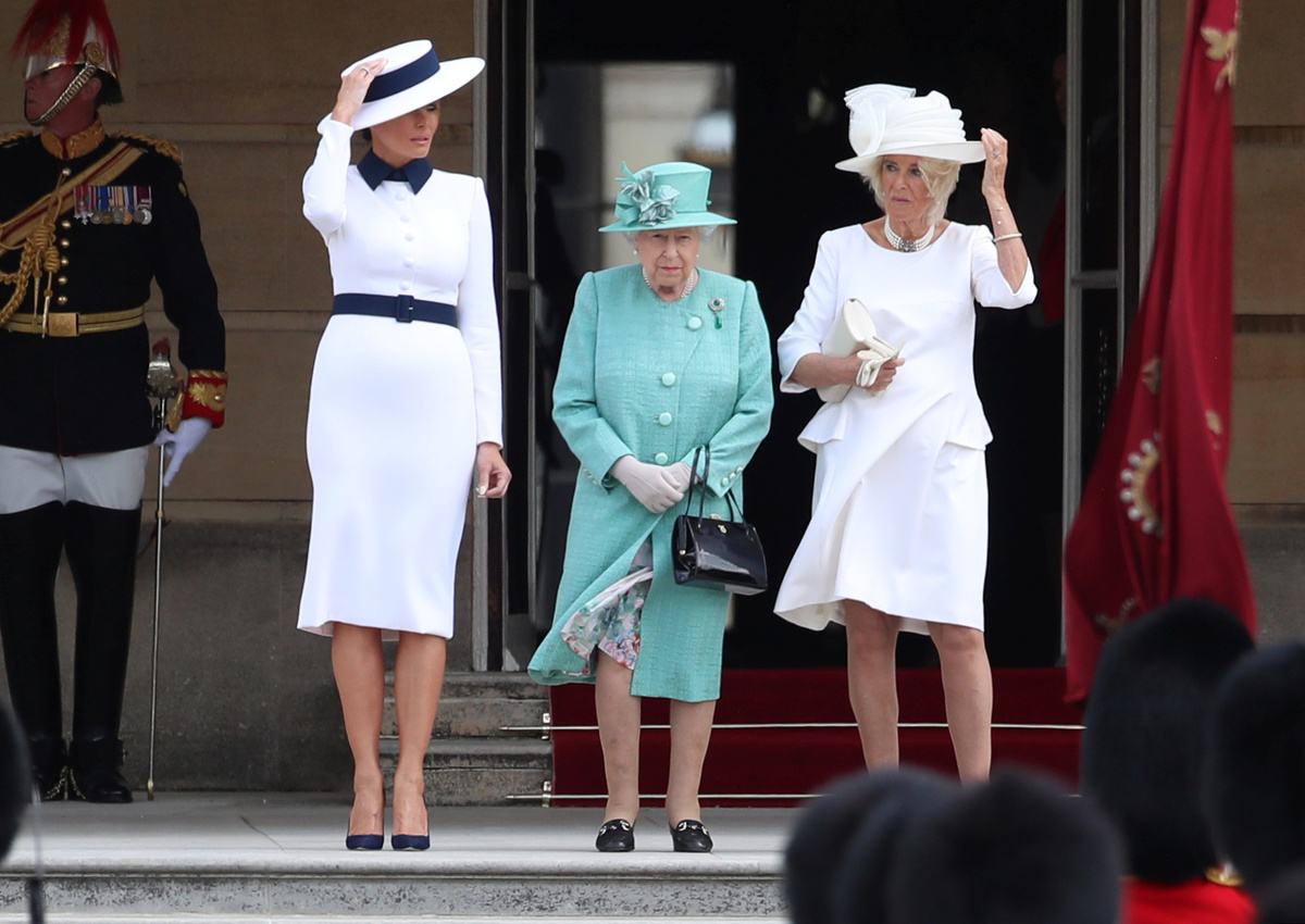 At Buckingham Palace, Melania - in an elegant, white below-the-knee Dolce & Gabbana dress with navy blue collar and belt and a custom hat by Herve Pierre - stood alongside the queen and Charles's wife Camilla, while Charles and the president inspected the guard.