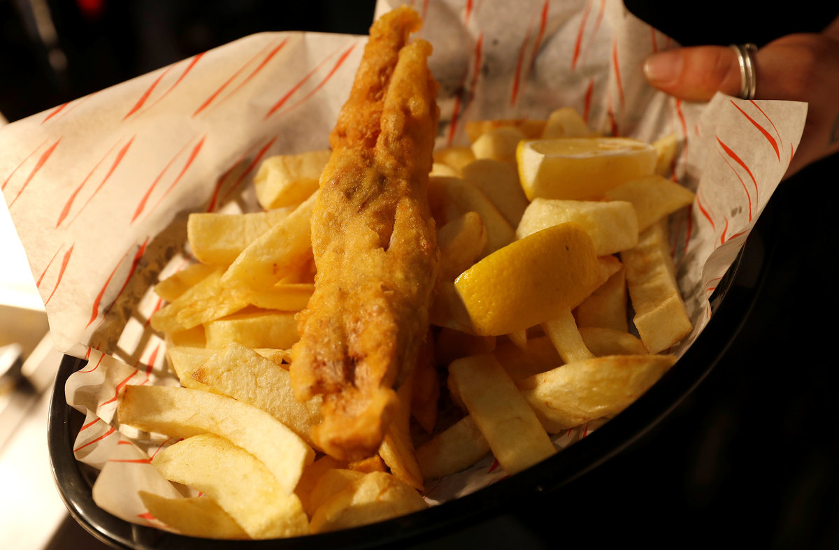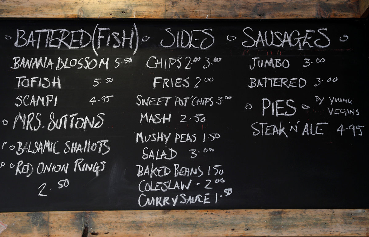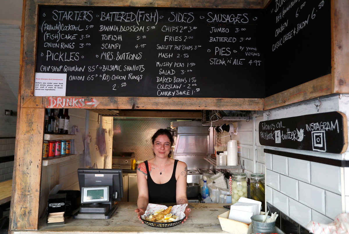 LONDON (Reuters) - Fish and chips, scampi and prawn cocktail are all on the menu at chippie owner Daniel Sutton's newest branch, with one caveat: "There's no fish in our fish," he says.