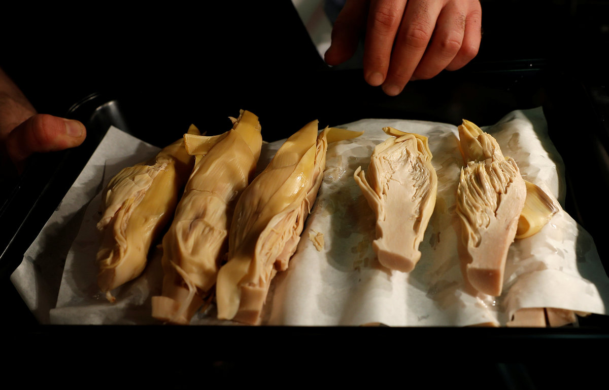 The "vegan fish" is made from banana blossom marinated in seaweed and the sea plant samphire to give it a fishy taste, then deep fried. Vegan "prawns" made of Japanese potato starch are battered and served as scampi.