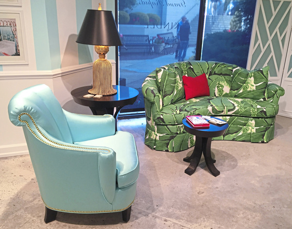 An example of the fearless mixing of color and pattern is the turquoise Channel Back lounge chair paired with the Dorotheum loveseat upholstered in a Draper signature fabric, Brazilliance, a large banana leaf pattern.