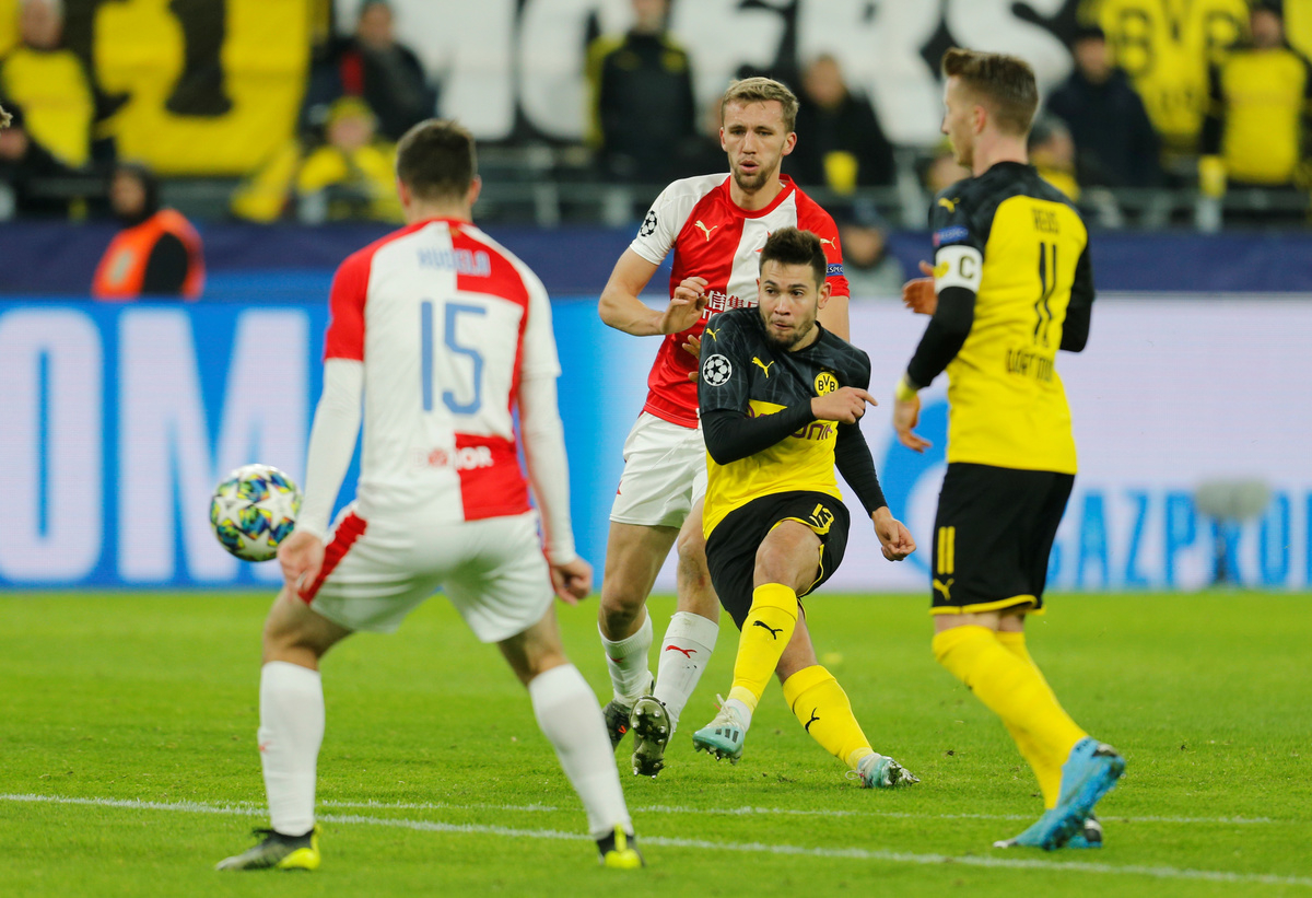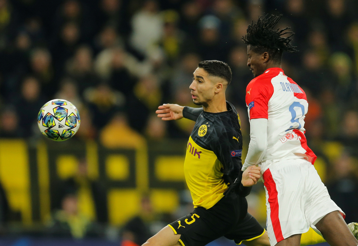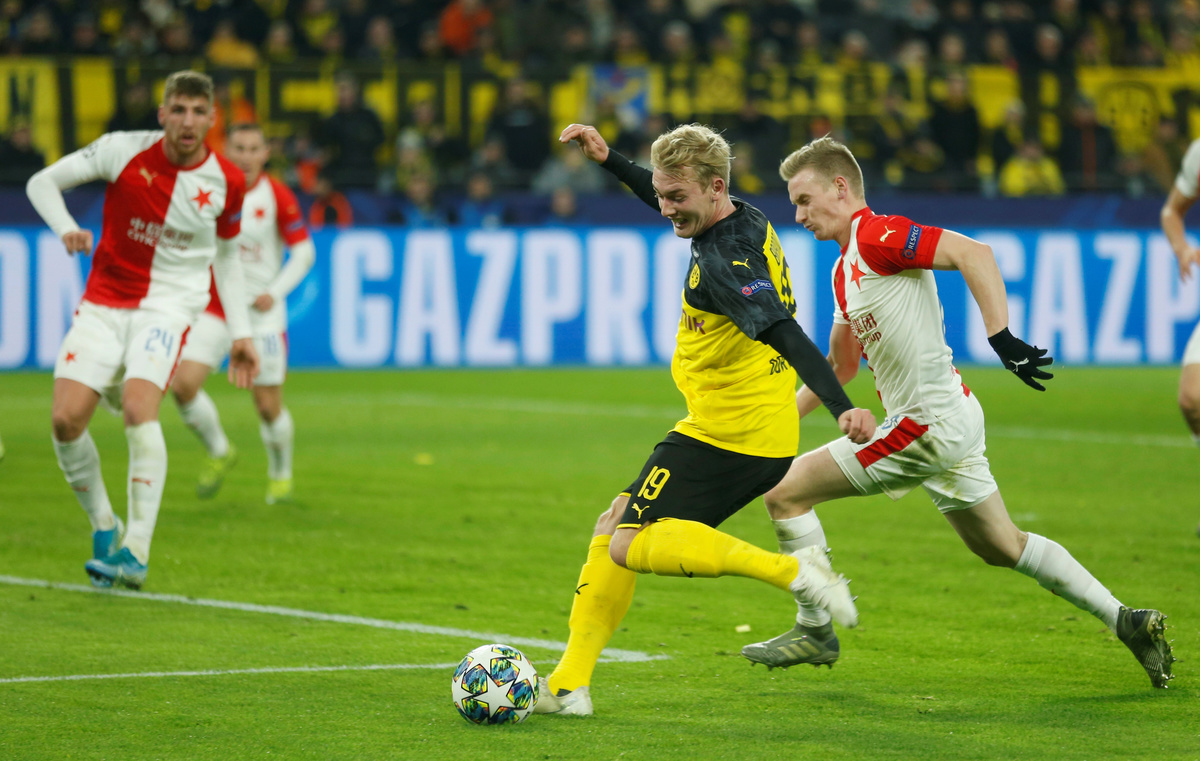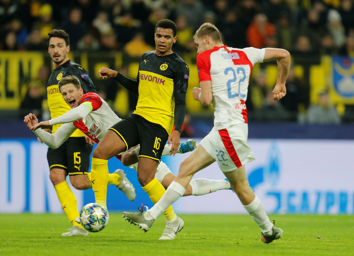 DORTMUND, Germany (Reuters) - Borussia Dortmund beat Slavia Prague 2-1 on Tuesday with goals from Jadon Sancho and Julian Brandt to advance to the Champions League knockout stage, leaving Italian side Inter Milan in third place of Group F.