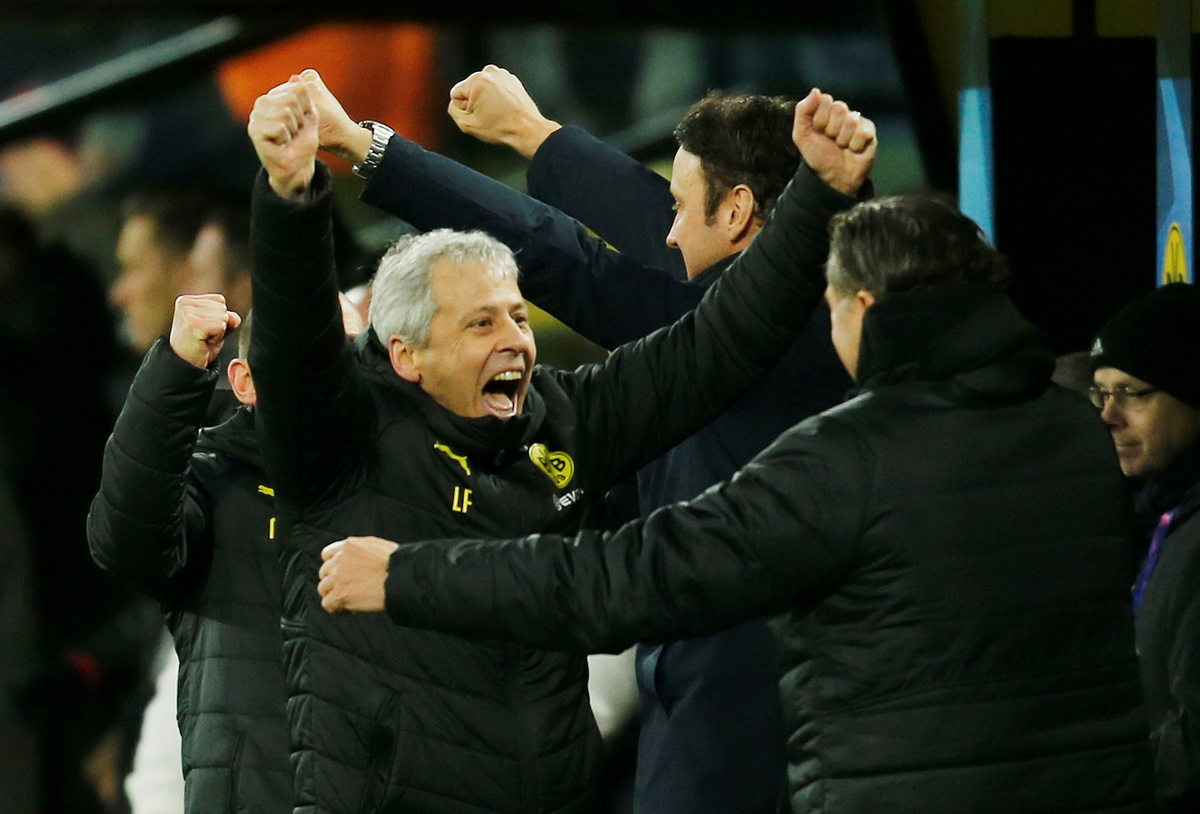 Soccer Football - Champions League - Group F - Borussia Dortmund v Slavia Prague - Signal Iduna Park, Dortmund, Germany - December 10, 2019 Borussia Dortmund players celebrate their first goal scored by Jadon Sancho REUTERS/Leon KuegelerSoccer Football - Champions League - Group F - Borussia Dortmund v Slavia Prague - Signal Iduna Park, Dortmund, Germany - December 10, 2019 Borussia Dortmund's Raphael Guerreiro in action REUTERS/Leon KuegelerSoccer Football - Champions League - Group F - Borussia Dortmund v Slavia Prague - Signal Iduna Park, Dortmund, Germany - December 10, 2019 Borussia Dortmund's Mats Hummels in action with Slavia Prague's Petr Sevcik REUTERS/Leon KuegelerSoccer Football - Champions League - Group F - Borussia Dortmund v Slavia Prague - Signal Iduna Park, Dortmund, Germany - December 10, 2019 Borussia Dortmund's Achraf Hakimi in action with Slavia Prague's Peter Olayinka REUTERS/Leon KuegelerSoccer Football - Champions League - Group F - Borussia Dortmund v Slavia Prague - Signal Iduna Park, Dortmund, Germany - December 10, 2019 Borussia Dortmund coach Lucien Favre celebrates at the end of the match REUTERS/Leon Kuegeler