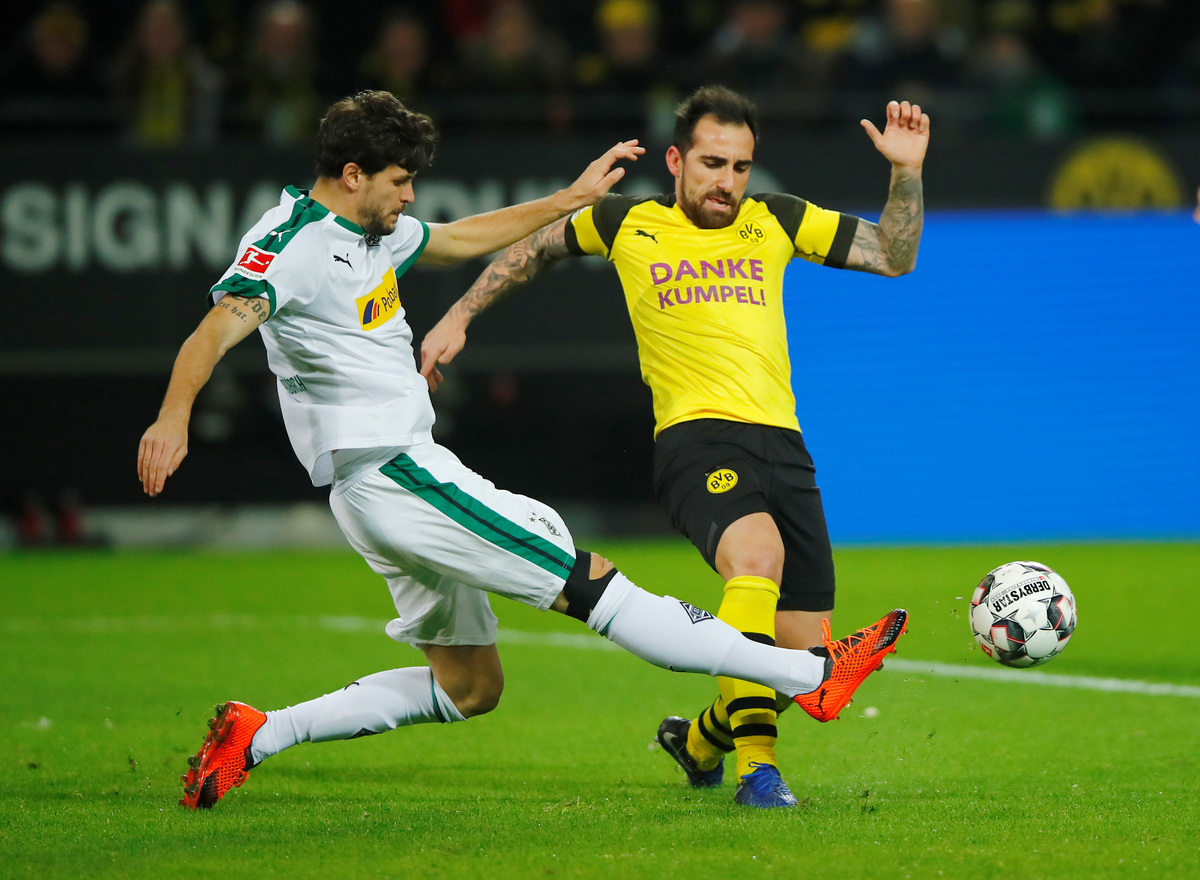 Soccer Football - Bundesliga - Borussia Dortmund v Borussia Moenchengladbach - Signul Iduna Park, Dortmund, Germany - December 21, 2018 Borussia Monchengladbach's Tobias Strobl in action with Borussia Dortmund's Paco Alcacer REUTERS/Wolfgang Rattay DFL regulations prohibit any use of photographs as image sequences and/or quasi-video