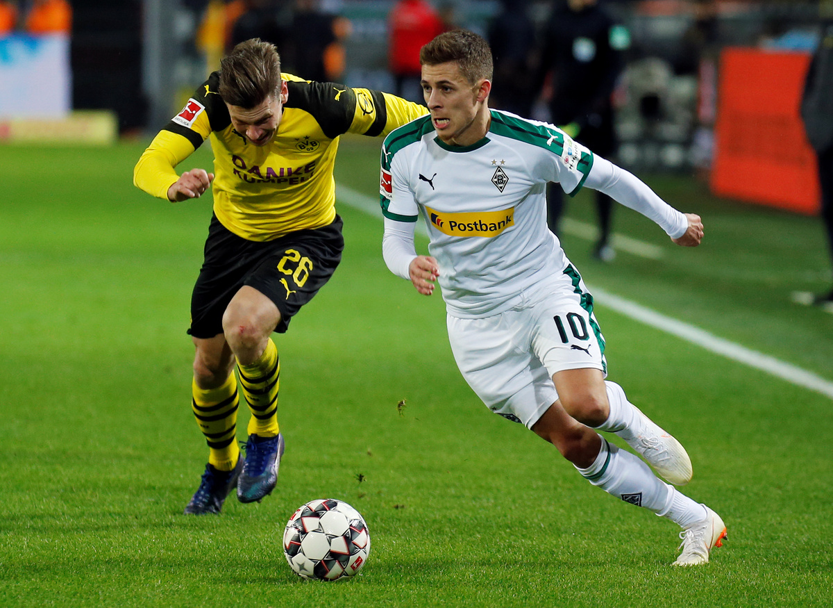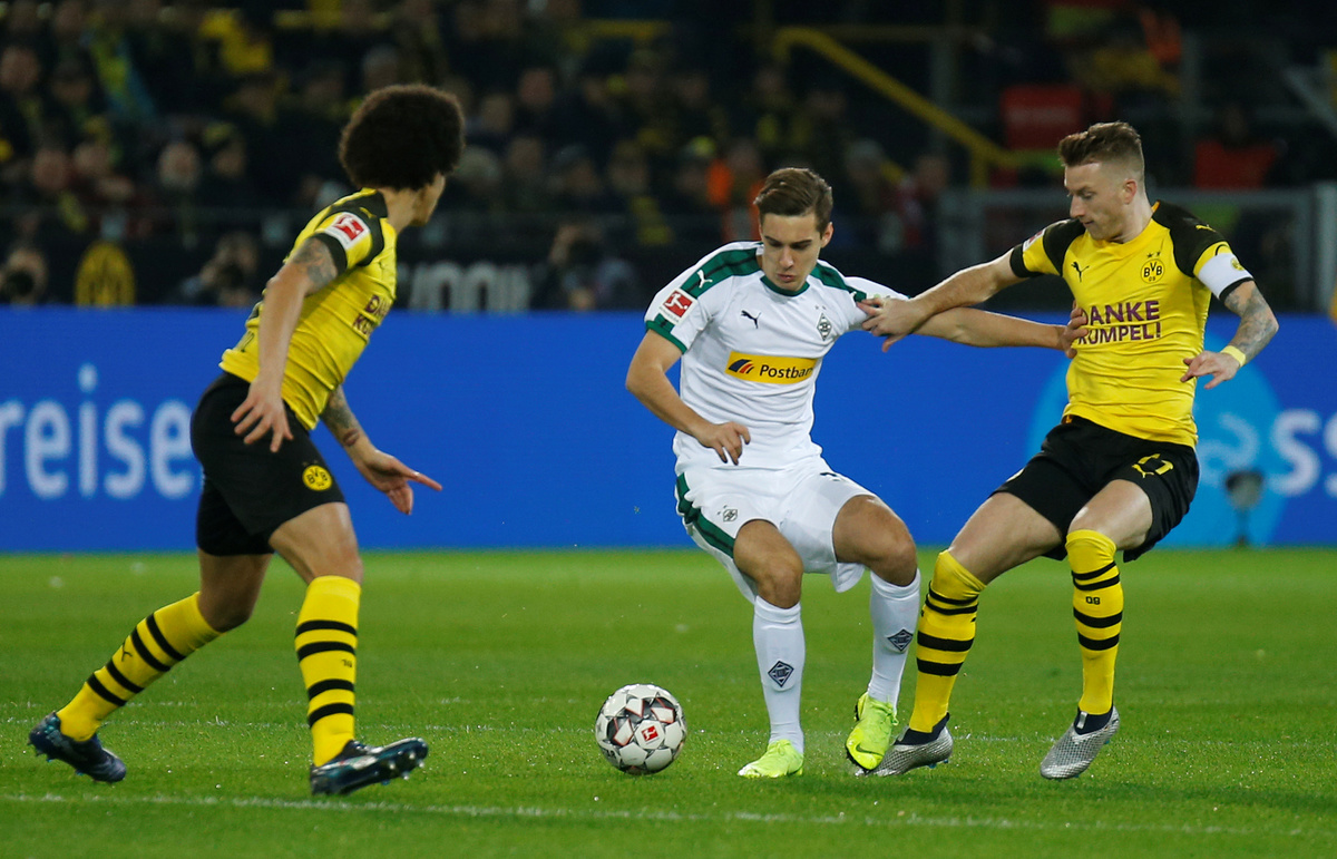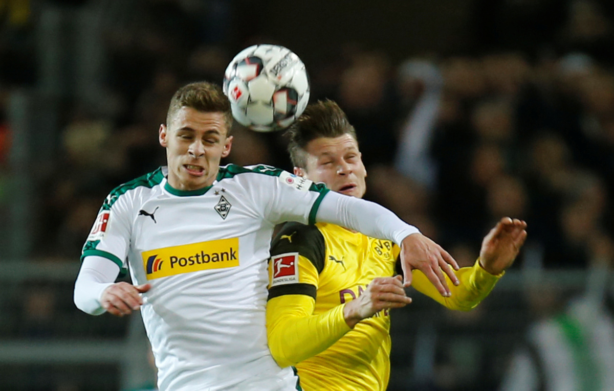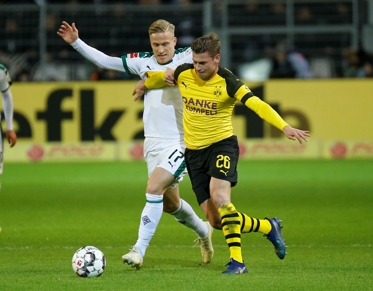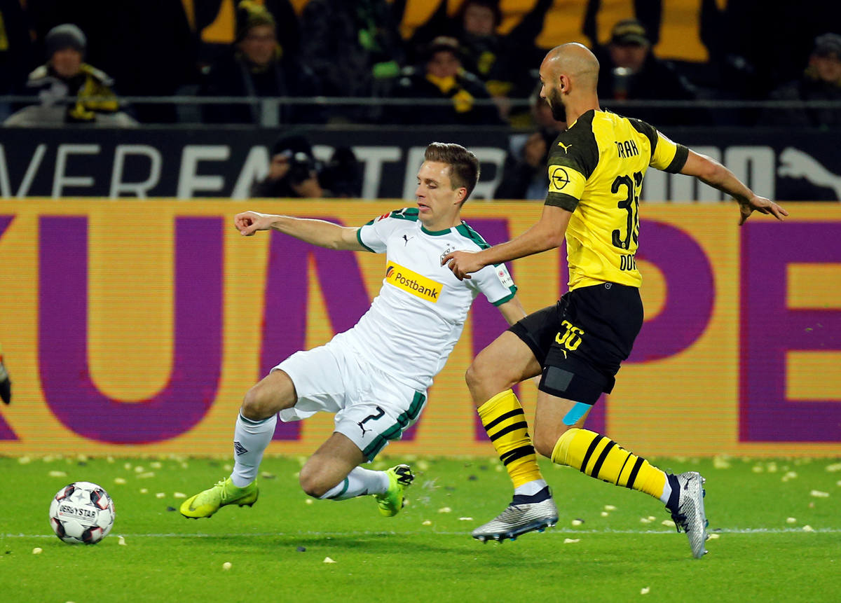 Soccer Football - Bundesliga - Borussia Dortmund v Borussia Moenchengladbach - Signul Iduna Park, Dortmund, Germany - December 21, 2018 Borussia Monchengladbach's Patrick Herrmann in action with Borussia Dortmund's Omer Toprak REUTERS/Leon Kuegeler DFL regulations prohibit any use of photographs as image sequences and/or quasi-videoSoccer Football - Bundesliga - Borussia Dortmund v Borussia Moenchengladbach - Signul Iduna Park, Dortmund, Germany - December 21, 2018 Borussia Monchengladbach's Florian Neuhaus in action with Borussia Dortmund's Marco Reus REUTERS/Leon Kuegeler DFL regulations prohibit any use of photographs as image sequences and/or quasi-videoSoccer Football - Bundesliga - Borussia Dortmund v Borussia Moenchengladbach - Signul Iduna Park, Dortmund, Germany - December 21, 2018 Borussia Monchengladbach's Thorgan Hazard in action with Borussia Dortmund's Lukasz Piszczek REUTERS/Leon Kuegeler DFL regulations prohibit any use of photographs as image sequences and/or quasi-video