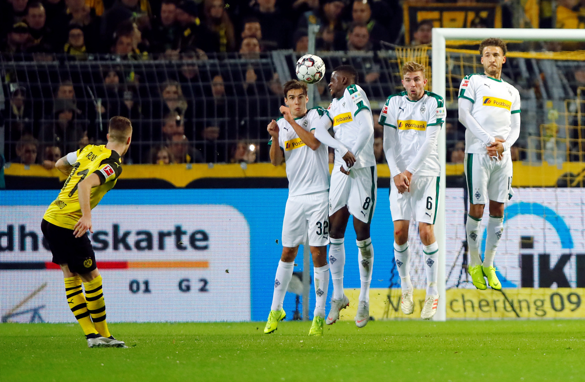 Soccer Football - Bundesliga - Borussia Dortmund v Borussia Moenchengladbach - Signul Iduna Park, Dortmund, Germany - December 21, 2018 Borussia Dortmund's Marco Reus shoots at goal from a free kick as Borussia Monchengladbach's Florian Neuhaus, Denis Zakaria and team mates attempt to block REUTERS/Wolfgang Rattay DFL regulations prohibit any use of photographs as image sequences and/or quasi-video