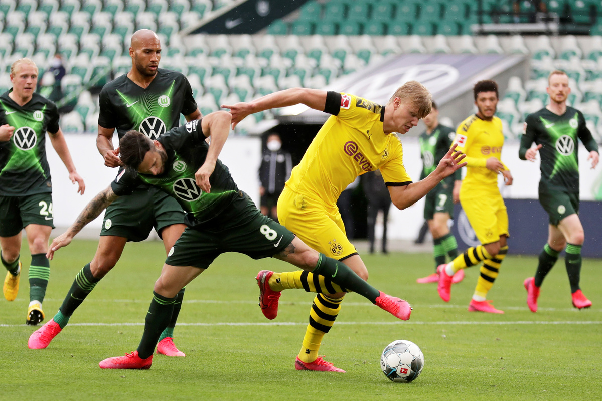 Soccer Football - Bundesliga - VfL Wolfsburg v Borussia Dortmund - Volkswagen Arena, Wolfsburg, Germany - May 23, 2020 Borussia Dortmund's Erling Haaland in action with VfL Wolfsburg's Renato Steffen, as play resumes behind closed doors following the outbreak of the coronavirus disease (COVID-19) Michael Sohn/Pool via REUTERS