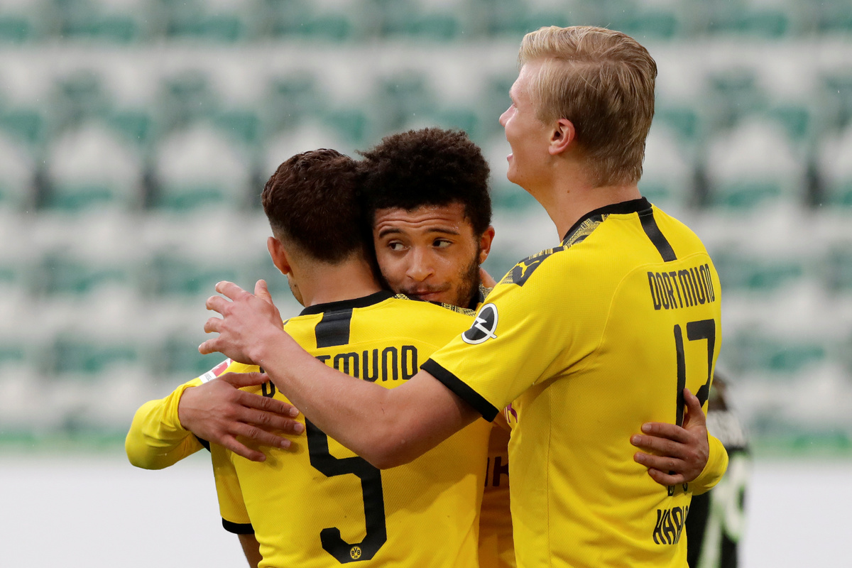Soccer Football - Bundesliga - VfL Wolfsburg v Borussia Dortmund - Volkswagen Arena, Wolfsburg, Germany - May 23, 2020 Borussia Dortmund's Achraf Hakimi celebrates scoring their second goal with Jadon Sancho and Erling Haaland, as play resumes behind closed doors following the outbreak of the coronavirus disease (COVID-19) Michael Sohn/Pool via REUTERS