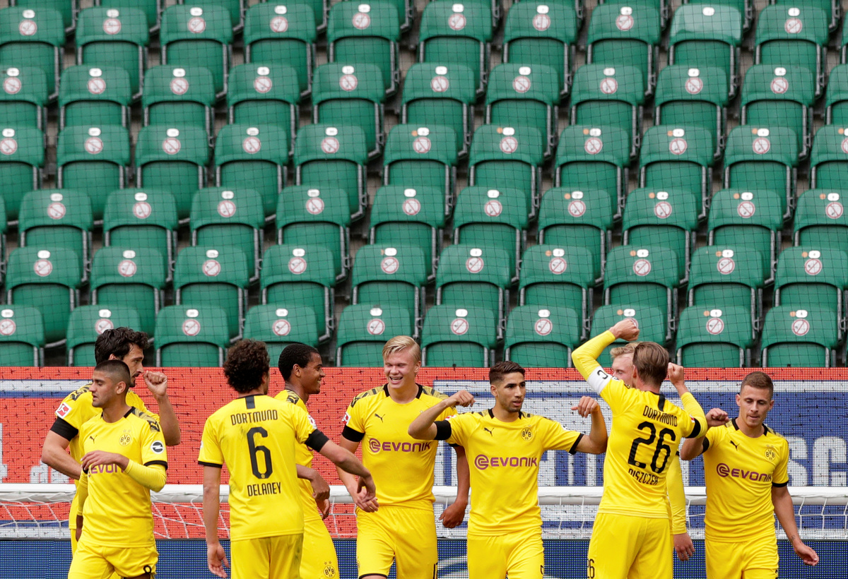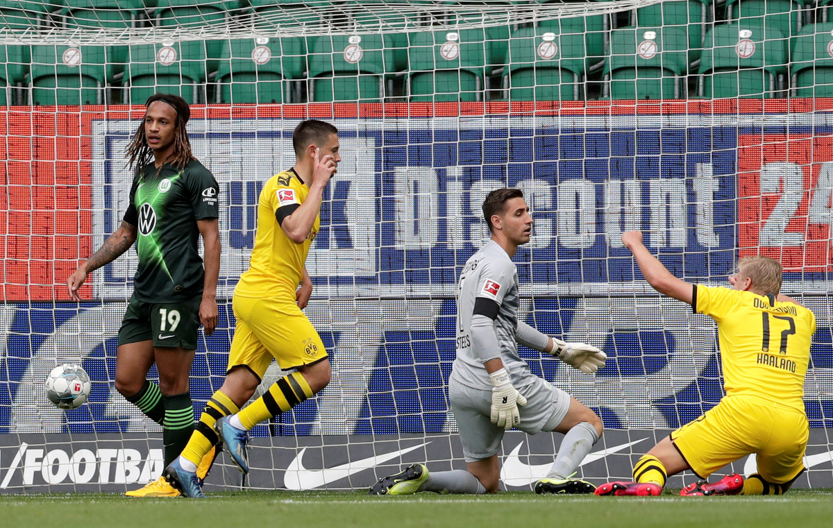 Soccer Football - Bundesliga - VfL Wolfsburg v Borussia Dortmund - Volkswagen Arena, Wolfsburg, Germany - May 23, 2020 Borussia Dortmund's Raphael Guerreiro celebrates scoring their first goal, as play resumes behind closed doors following the outbreak of the coronavirus disease (COVID-19) Michael Sohn/Pool via REUTERS Soccer Football - Bundesliga - VfL Wolfsburg v Borussia Dortmund - Volkswagen Arena, Wolfsburg, Germany - May 23, 2020 Borussia Dortmund's Jadon Sancho and Erling Haaland celebrate their second goal scored by Achraf Hakimi, as play resumes behind closed doors following the outbreak of the coronavirus disease (COVID-19) Michael Sohn/Pool via REUTERS Soccer Football - Bundesliga - VfL Wolfsburg v Borussia Dortmund - Volkswagen Arena, Wolfsburg, Germany - May 23, 2020 Borussia Dortmund's Raphael Guerreiro celebrates scoring their first goal with teammates, as play resumes behind closed doors following the outbreak of the coronavirus disease (COVID-19) Michael Sohn/Pool via REUTERS Soccer Football - Bundesliga - VfL Wolfsburg v Borussia Dortmund - Volkswagen Arena, Wolfsburg, Germany - May 23, 2020 Borussia Dortmund's Raphael Guerreiro takes a corner kick, as play resumes behind closed doors following the outbreak of the coronavirus disease (COVID-19) Michael Sohn/Pool via REUTERS Soccer Football - Bundesliga - VfL Wolfsburg v Borussia Dortmund - Volkswagen Arena, Wolfsburg, Germany - May 23, 2020 Borussia Dortmund's Raphael Guerreiro celebrates scoring their first goal with teammates, as play resumes behind closed doors following the outbreak of the coronavirus disease (COVID-19) Michael Sohn/Pool via REUTERS