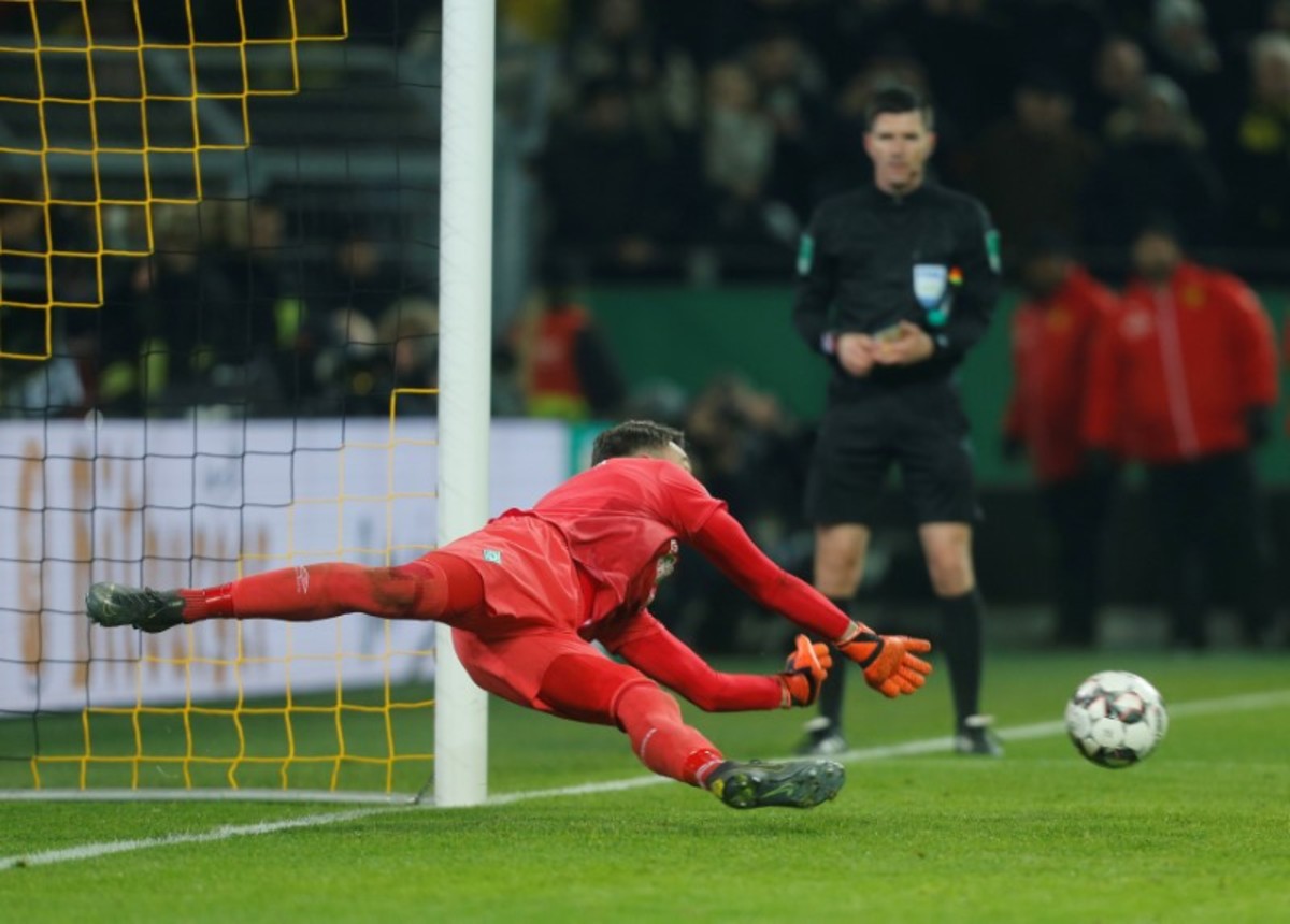 Soccer Football - DFB Cup - Third Round - Borussia Dortmund v Werder Bremen - Signal Iduna Park, Dortmund, Germany - February 5, 2019 Werder Bremen's Jiri Pavlenka saves a penalty during the shootout REUTERS/Leon Kuegeler