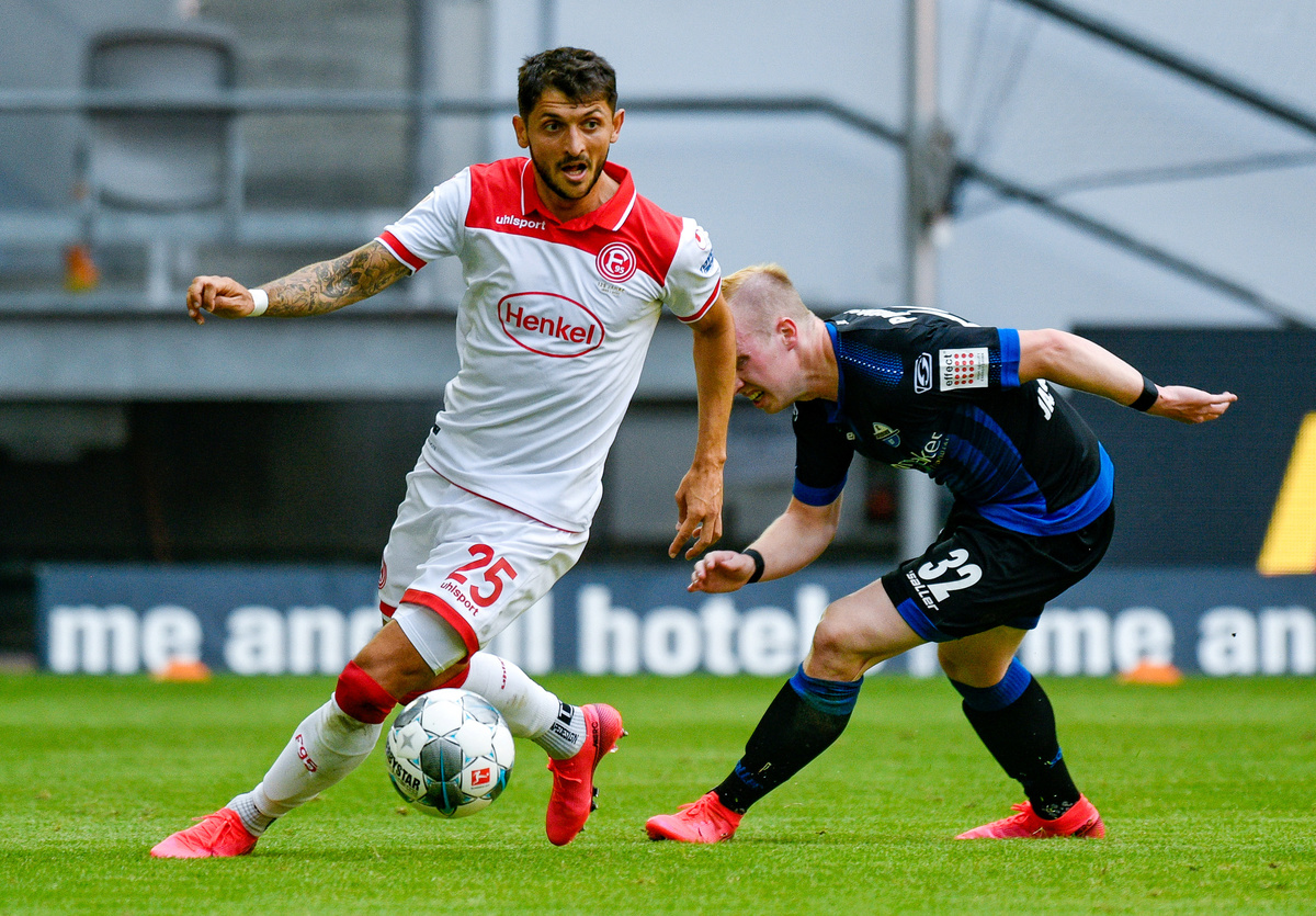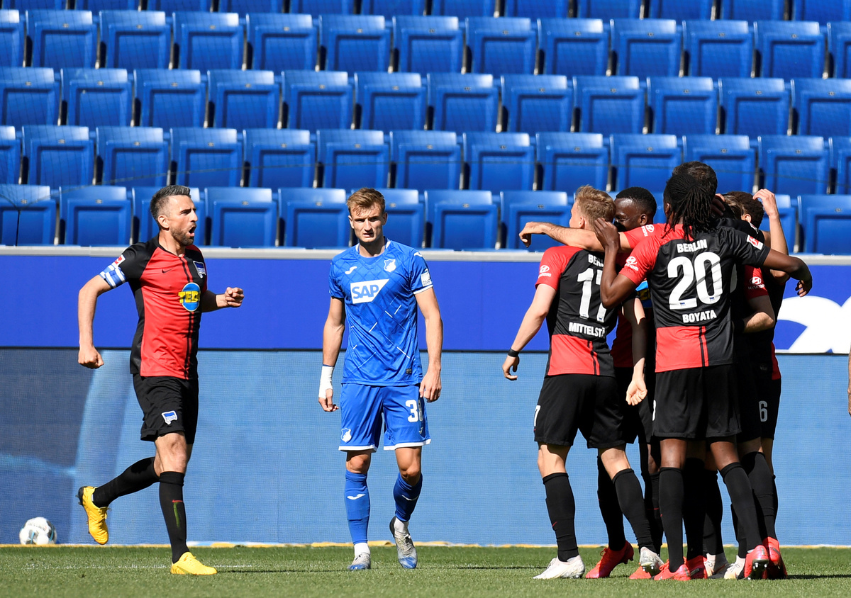 Soccer Football - Bundesliga - FC Augsburg v VfL Wolfsburg - WWK Arena, Augsburg, Germany - May 16, 2020 FC Augsburg's Florian Niederlechner and FC Augsburg's Raphael Framberger in action with Wolfsburg's Maximilian Arnold as play resumes behind closed doors following the outbreak of the coronavirus disease (COVID-19) Tobias Hase/Pool via REUTERS Soccer Football - Bundesliga - FC Augsburg v VfL Wolfsburg - WWK Arena, Augsburg, Germany - May 16, 2020 Wolfsburg's Renato Steffen celebrates scoring their first goal as play resumes behind closed doors following the outbreak of the coronavirus disease (COVID-19) Tobias Hase/Pool via REUTERS Soccer Football - Bundesliga - TSG 1899 Hoffenheim v Hertha BSC - PreZero Arena, Sinsheim, Germany - May 16, 2020 Hertha Berlin players celebrate their first goal as Hoffenheim's Stefan Posch reacts, as play resumes behind closed doors following the outbreak of the coronavirus disease (COVID-19) Thomas Kienzle/Pool via REUTERS Soccer Football - Bundesliga - TSG 1899 Hoffenheim v Hertha BSC - PreZero Arena, Sinsheim, Germany - May 16, 2020 Hertha Berlin's Matheus Cunha celebrates scoring their third goal with teammates, as play resumes behind closed doors following the outbreak of the coronavirus disease (COVID-19) Thomas Kienzle/Pool via REUTERS Soccer Football - Bundesliga - Fortuna Dusseldorf v SC Paderborn - Merkur Spiel-Arena, Dusseldorf, Germany - May 16, 2020 General view before the match, as play resumes behind closed doors following the outbreak of the coronavirus disease (COVID-19) Carsten Lappe/Pool via REUTERS Soccer Football - Bundesliga - Fortuna Dusseldorf v SC Paderborn - Merkur Spiel-Arena, Dusseldorf, Germany - May 16, 2020 Fortuna Dusseldorf's Matthias Zimmermann in action with Paderborn's Dennis Jastrzembski, as play resumes behind closed doors following the outbreak of the coronavirus disease (COVID-19) Sascha Schuermann/Pool via REUTERS