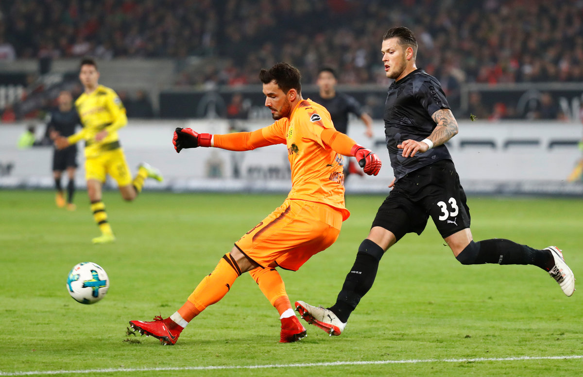 Soccer Football - Bundesliga - VfB Stuttgart vs Borussia Dortmund - Mercedes-Benz Arena, Stuttgart, Germany - November 17, 2017 Borussia Dortmund’s Roman Burki in action with Stuttgart's Daniel Ginczek REUTERS/Kai Pfaffenbach