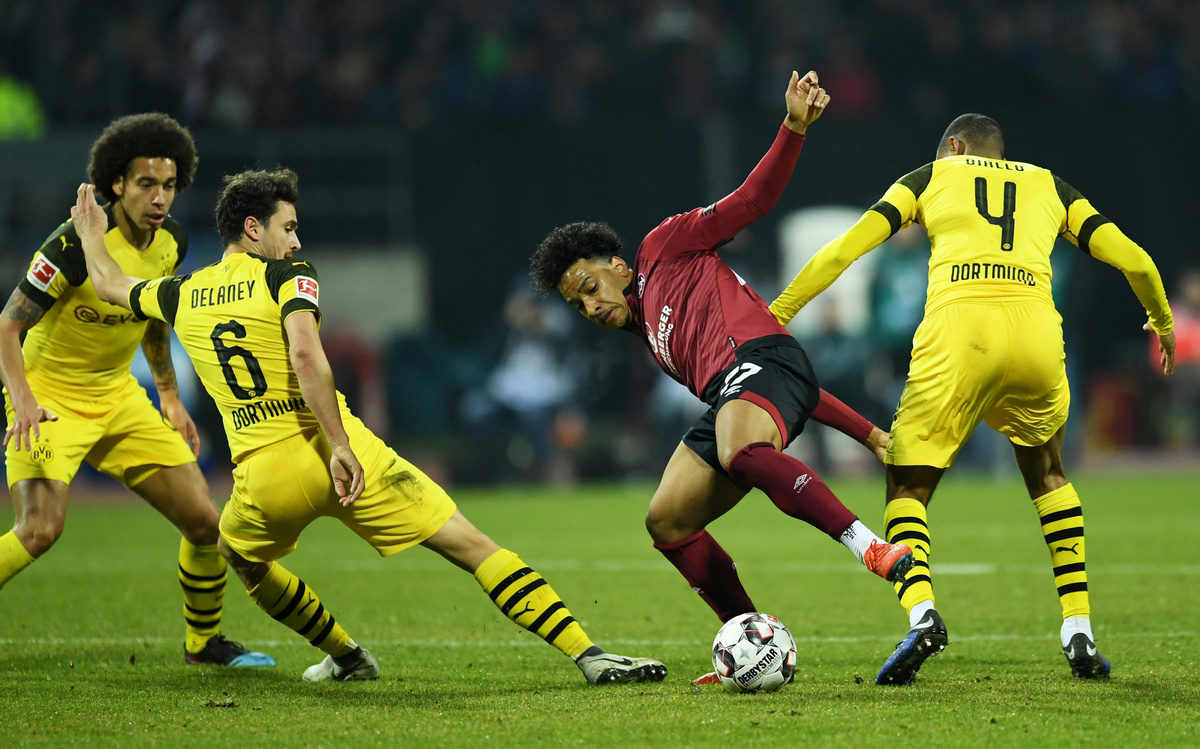 Soccer Football - Bundesliga - 1. FC Nurnberg v Borussia Dortmund - Max-Morlock-Stadion, Nuremberg, Germany - February 18, 2019 Borussia Dortmund's Jadon Sancho in action with 1. FC Nurnberg's Lukas Muhl and Ondrej Petrak REUTERS/Andreas Gebert DFL regulations prohibit any use of photographs as image sequences and/or quasi-video