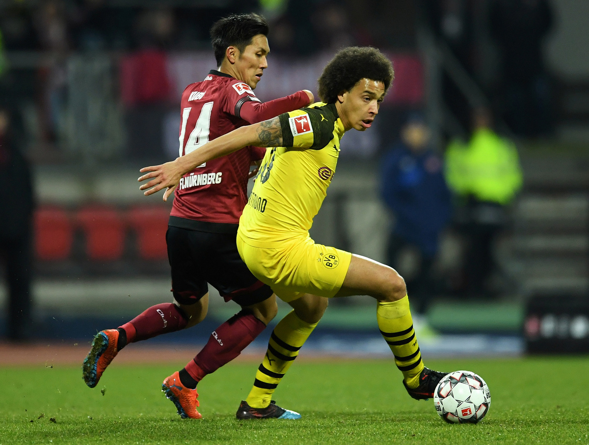 Soccer Football - Bundesliga - 1. FC Nurnberg v Borussia Dortmund - Max-Morlock-Stadion, Nuremberg, Germany - February 18, 2019 Borussia Dortmund's Axel Witsel in action with 1. FC Nurnberg's Yuya Kubo REUTERS/Andreas Gebert DFL regulations prohibit any use of photographs as image sequences and/or quasi-video