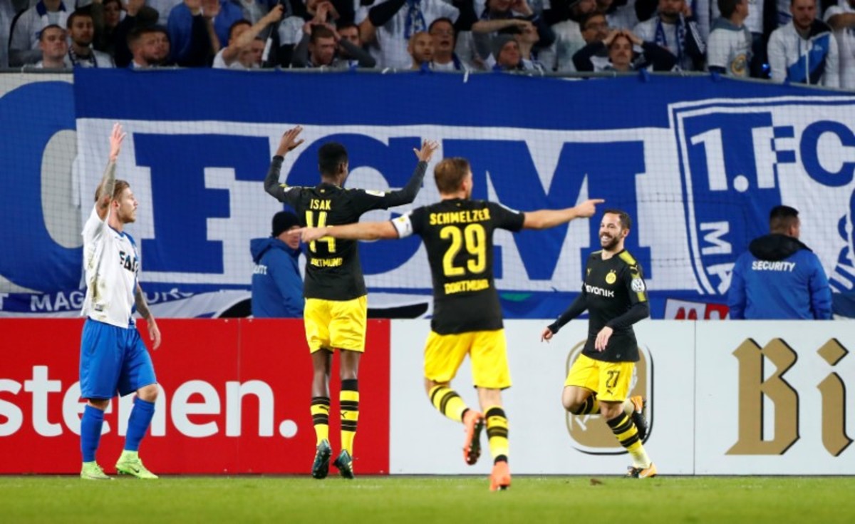 Soccer Football - DFB Cup Second Round - Magdeburg v Borussia Dortmund - MDCC-Arena, Magdeburg, Germany - October 24, 2017 Borussia Dortmund’s Alexander Isak in action with Magdeburg’s Philip Turpitz REUTERS/Hannibal Hanschke Soccer Football - DFB Cup Second Round - Magdeburg v Borussia Dortmund - MDCC-Arena, Magdeburg, Germany - October 24, 2017 Borussia Dortmund’s Gonzalo Castro scores their first goal REUTERS/Hannibal Hanschke Soccer Football - DFB Cup Second Round - Magdeburg v Borussia Dortmund - MDCC-Arena, Magdeburg, Germany - October 24, 2017 Borussia Dortmund’s Gonzalo Castro celebrates scoring their first goal with Alexander Isak and Marcel Schmelzer REUTERS/Hannibal Hanschke Soccer Football - DFB Cup Second Round - Magdeburg v Borussia Dortmund - MDCC-Arena, Magdeburg, Germany - October 24, 2017 Borussia Dortmund coach Peter Bosz reacts REUTERS/Hannibal Hanschke Soccer Football - DFB Cup Second Round - Magdeburg v Borussia Dortmund - MDCC-Arena, Magdeburg, Germany - October 24, 2017 Magdeburg fans display a banner and let flares off REUTERS/Hannibal Hanschke