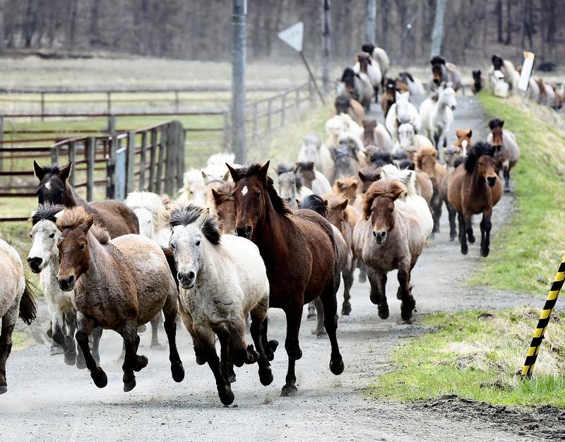 Rare native horses known as dosanko raced along a road stretching across the Shizunai Livestock Farm of the Hokkaido University in Shinhidaka, Hokkaido, on Friday.