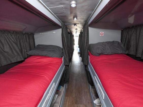 A double decker bus has been converted into a shelter for homeless people seeking refuge from the cold winter.