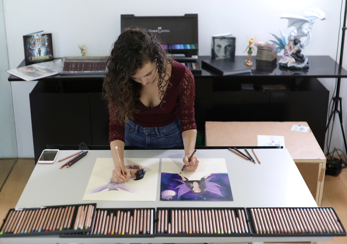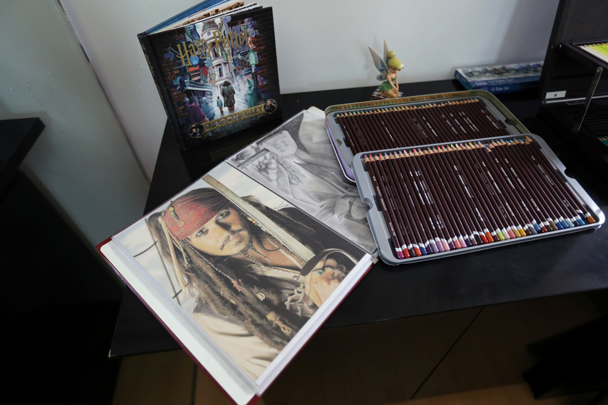 She began drawing seriously with colored pencils and gel pens at age 16, inspired by an Italian street artist.