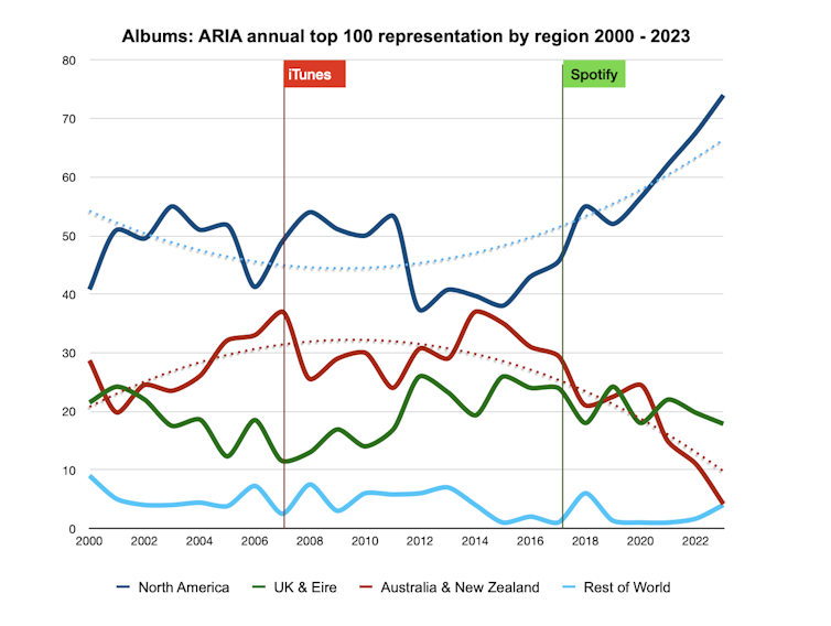 My recently published analysis of Australia’s best-selling singles and albums from 2000 to 2023 shows a significant decline in the representation of artists from Australia and non-English-speaking countries.