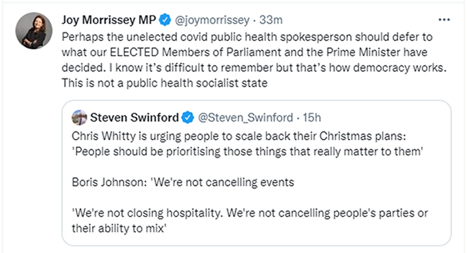 Ms Morrissey, the MP for Beaconsfield, deleted a tweet in which she said: “Perhaps the unelected covid public health spokesperson should defer to what our ELECTED Members of Parliament and the Prime Minister have decided.