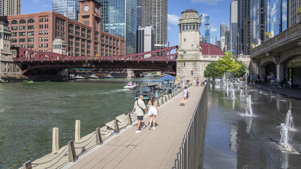 That sort of thinking is still evolving in Chicago. Even the first phase of the downtown Riverwalk, the portion that runs from Michigan Avenue east toward the lake, was “pretty far above the water,” said Frisbie, a distance that was removed for the second and third phases. Now, people stroll past floating gardens, have a drink on riverfront steps near docking boats and sit in Adirondack chairs for concerts.