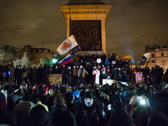 The march began peacefully, with several demonstrators climbing the base of Nelson's column and chanting "one solution, revolution".