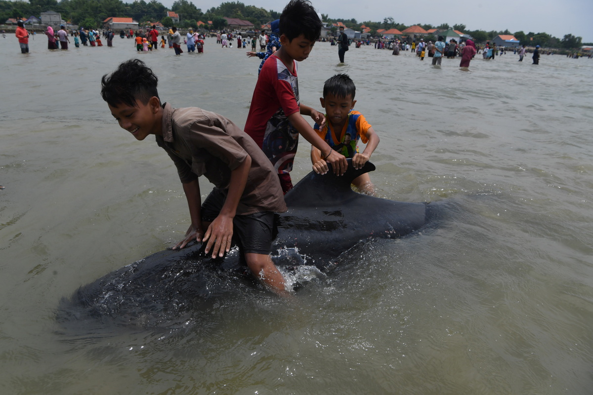 Locals try to lift a whale, one of dozens which got stranded at a beach in Bangkalan, near Surabaya, East Java province, Indonesia, February 19, 2021 in this photo taken by Antara Foto. Antara Foto/Zabur Karuru/ via REUTERS Youths play with a whale, one of dozens which got stranded at a beach in Bangkalan, near Surabaya, East Java province, Indonesia, February 19, 2021 in this photo taken by Antara Foto. Antara Foto/Zabur Karuru/ via REUTERS