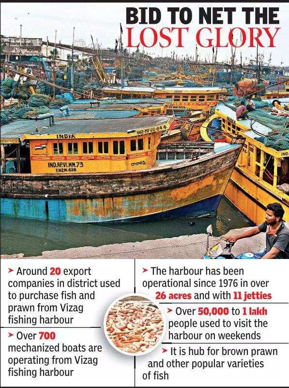 The much-hyped project has been in limbo due to various reasons. Vizag fishing harbour is one of the oldest in the country, but it now lacks proper sanitation facility, toilets, drainage system, storage facility, proper road, lighting, platform to dry fish and even rubber fenders to tag the boats safely.
