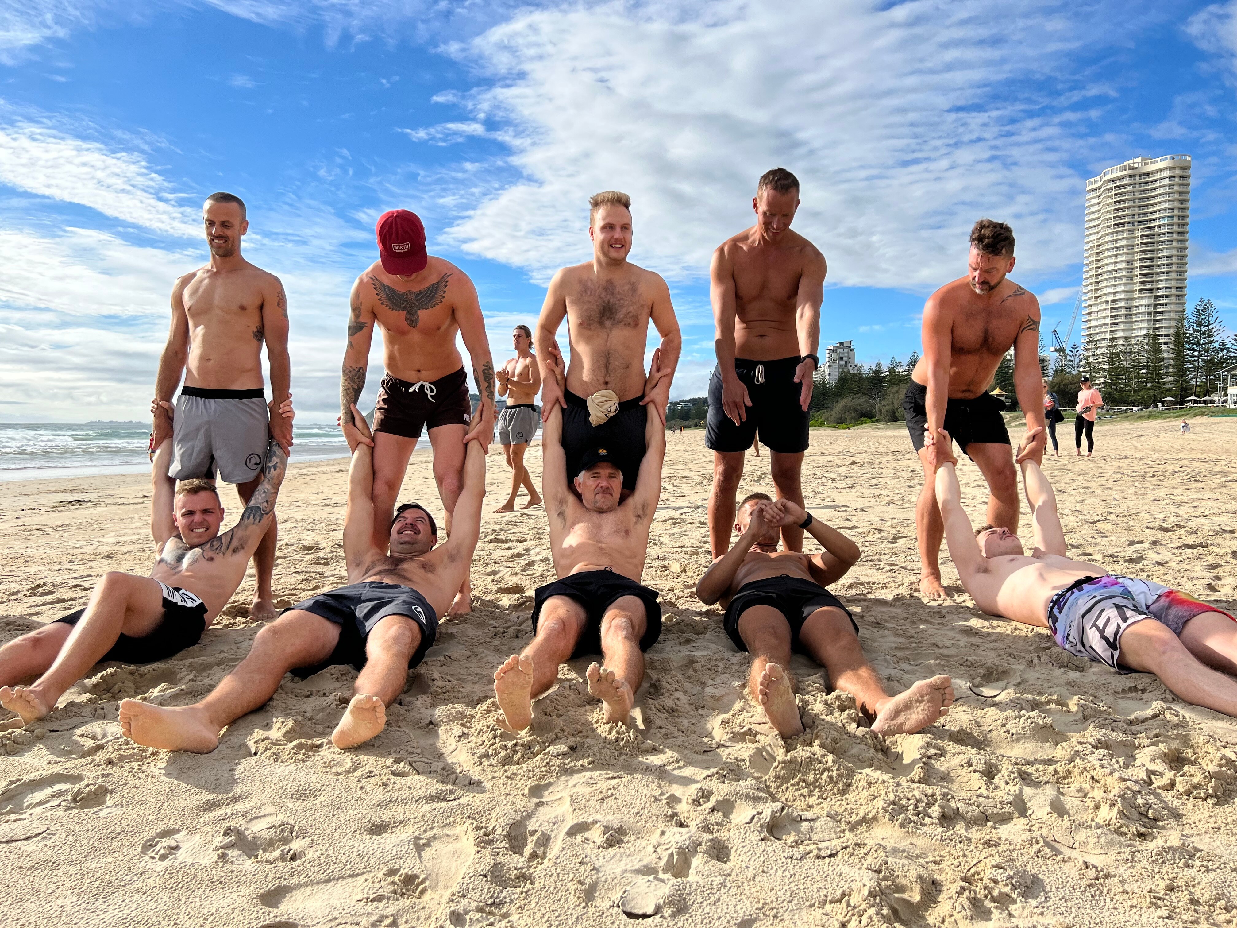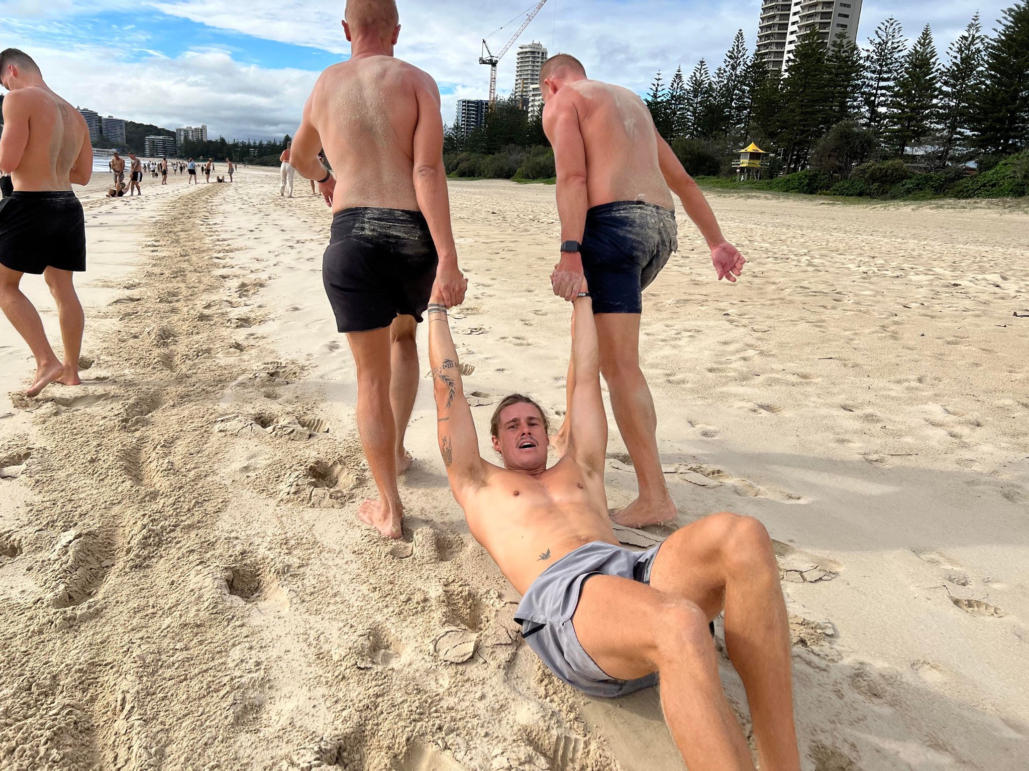 Being dragged along the beach for more than two kilometres doesn't sound like much fun, but it was a bonding experience for 50 men on the Gold Coast over the weekend.