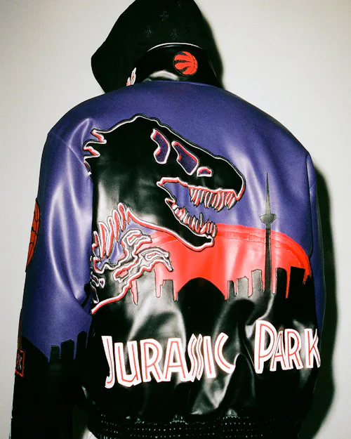 Featuring the Toronto skyline at sunset, the varsity jacket plays with a palette of primarily red, purple, and black shades. On the back of the design, the silhouette of the Jurassic Park dinosaur can be seen looming over the city skyline, while the film title embellishes the button of the jacket.