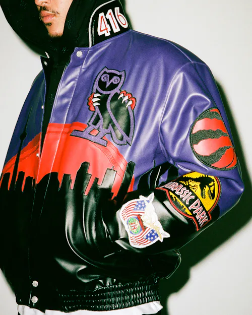 At the front, OVO’s signature owl logo is gripped by red raptor claws, which also clutch (and seemingly, tear) the brand’s written “OVO” text on the right arm. In true Hamilton style, patches decorate the left arm, revealing the Raptor’s mangled red basketball graphic, Jurassic Park’s logo, and Hamilton’s signature American flag motif. The Raptor’s basketball logo joins OVO branding and “416” on the collar of the jacket.