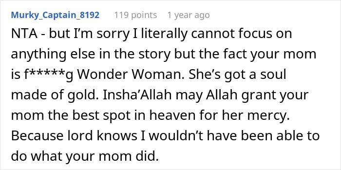 And some people in the comments, albeit not on the main topic of the post, expressed real admiration for the greatness of the spirit of the OP’s mom, who found the strength not only to reconcile with a cheating ex, but also from time to time to help him with his children. “Your mom is a Wonder Woman. She’s got a soul made of gold,” another commenter wrote excitedly.